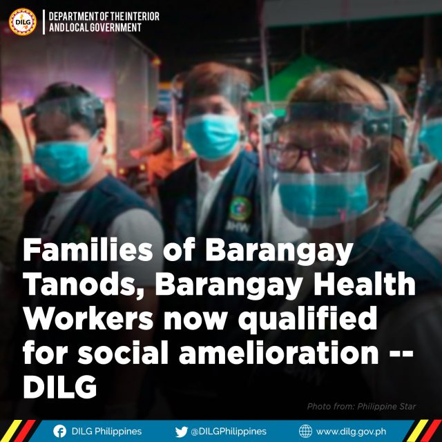 (Eagle News) – Families of barangay tanods and barangay health workers are qualified to receive financial aid under the Social Amelioration Program (SAP), the Department of Interior and Local Government (DILG) announced.