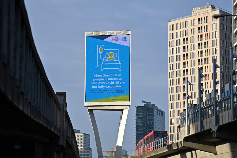 Signs promote the Government’s Covid-19 vaccine programme, and alert passers by “More than 80% of people in intensive care with Covid-19 are not fully vaccinated” near Canary Wharf in the Tower Hamlets district of east London on January 6, 2022. – The Office for National Statistics (ONS) released on Wednesday its latest coronavirus infection survey, showing more than one in 20 people had Covid-19 in the week ending December 31 in Britain — its highest infection rate recorded during the pandemic. (Photo by JUSTIN TALLIS / AFP)