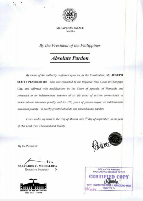 The certificate signed by President Duterte read: By virtue of the authority conferred upon me by the Constitution, Mr. Joseph Scott Pemberton – who was convicted by the Regional Trial Court in Olongapo City and affirmed with modification by the Court of Appeals, of Homicide and sentenced to an indeterminate sentence of six years prision correccional as indeterminate minimum penalty and 10 years of prision mayor as indeterminate maximum penalty – is hereby granted absolute and unconditional pardon.”