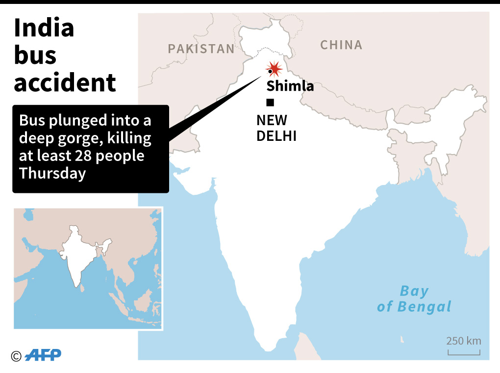 SHIMLA, India (AFP) — At least 28 people were killed Thursday after a bus plunged into a deep gorge in a Himalayan region of northern India popular with tourists, police said.