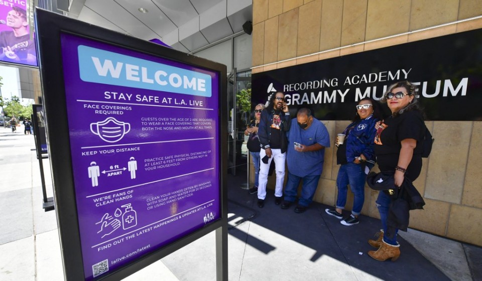 People wait to enter on the reopening day of the Grammy Museum where a sign is posted for coronavirus safety guidelines on May 21, 2021, in Los Angeles over a year after the museum closed due to the coronaviruscoronavirus pandemic. – California officials said today the state is on track to remove physical distancing guidelines and fully reopen its economy beginning on June 15. (Photo by Frederic J. BROWN / AFP)