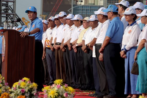 Cambodia’s strongman ruler hailed on July 27 the success of efforts to “eliminate traitors” at a mass rally ahead of an election without a credible opposition that will leave the country as a virtual one-party state. / AFP PHOTO / TANG CHHIN Sothy