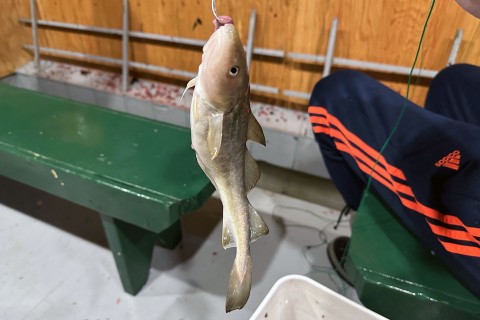 Inside one of the heated huts, Alexandra St-Yves, 27, gives a sharp tug on her fishing line and pulls up her catch from beneath the ice: a small fish called an Atlantic tomcod.