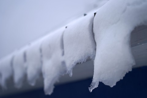 Snow melts on the roof of an ice fishing cabin in Sainte-Anne-de-la-Perade, Quebec, Canada on January 27, 2024. On a frozen river in Canada, a cluster of brightly coloured cabins stand out against the white snow as vehicles crawl to and fro.