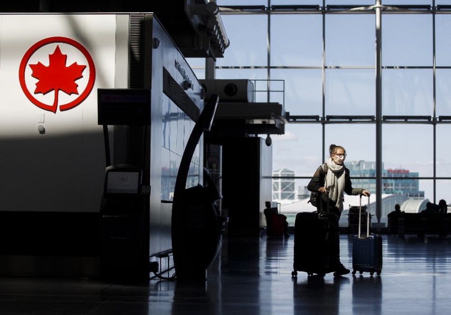 (FILES) In this file photo taken on April 1, 2020, a passenger wheels her luggage near an Air Canada logo at Toronto Pearson International Airport in Toronto, Canada. – Canada will require travellers to obtain a negative Covid-19 test before being allowed into the country, the government announced on December 30, 2020. (Photo by Cole Burston / GETTY IMAGES NORTH AMERICA / AFP)