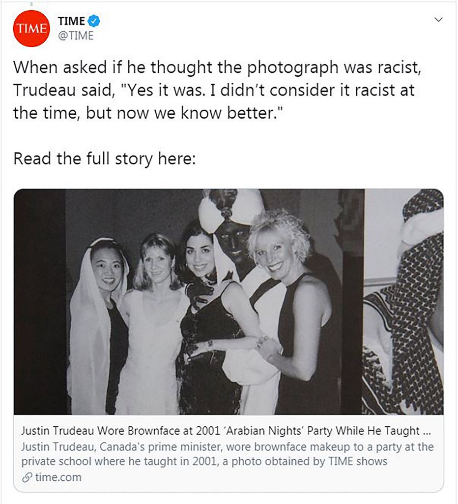 Time magazine published the photograph one week into a federal election campaign with Trudeau’s Liberal Party in a tight contest against the Conservatives led by Andrew Scheer.