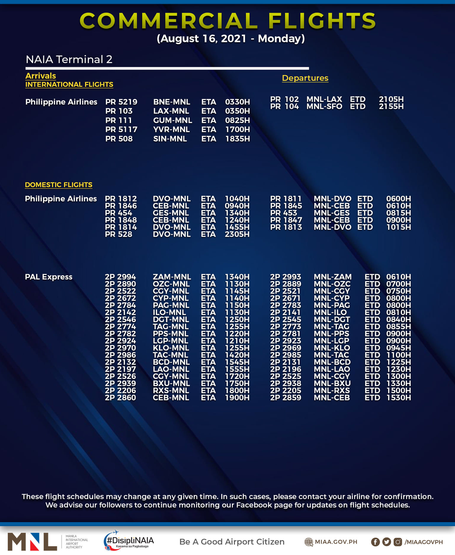MIAA advised passengers to coordinate with airlines and secure confirmation of their flights prior to the scheduled travel.