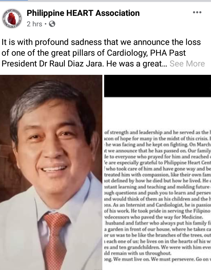 “It is with profound sadness that we announce the loss of one of the great pillars of cardiology, PHA past president Dr. Raul Diaz Jara. He was a great father, teacher, mentor, poet, author, singer, colleague, friend,” the Philippine Heart Association said in a statement on Tuesday, March 24.