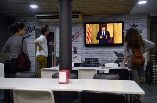 Three people listen to Catalan president Carles Puigdemont’s institutional statement on a television set in a bar in Barcelona on October 4, 2017.