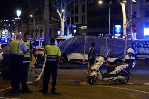Officers in Spain’s second-largest city said the ramming on Las Ramblas was a “terrorist attack”. The driver of a van that mowed into a packed street in Barcelona is still on the run, Spanish police said. / AFP PHOTO / Josep LAGO