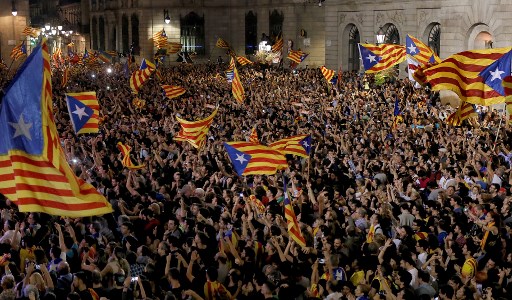 People gather to celebrate the proclamation of a Catalan republic at the Sant Jaume square in Barcelona on October 27, 2017.