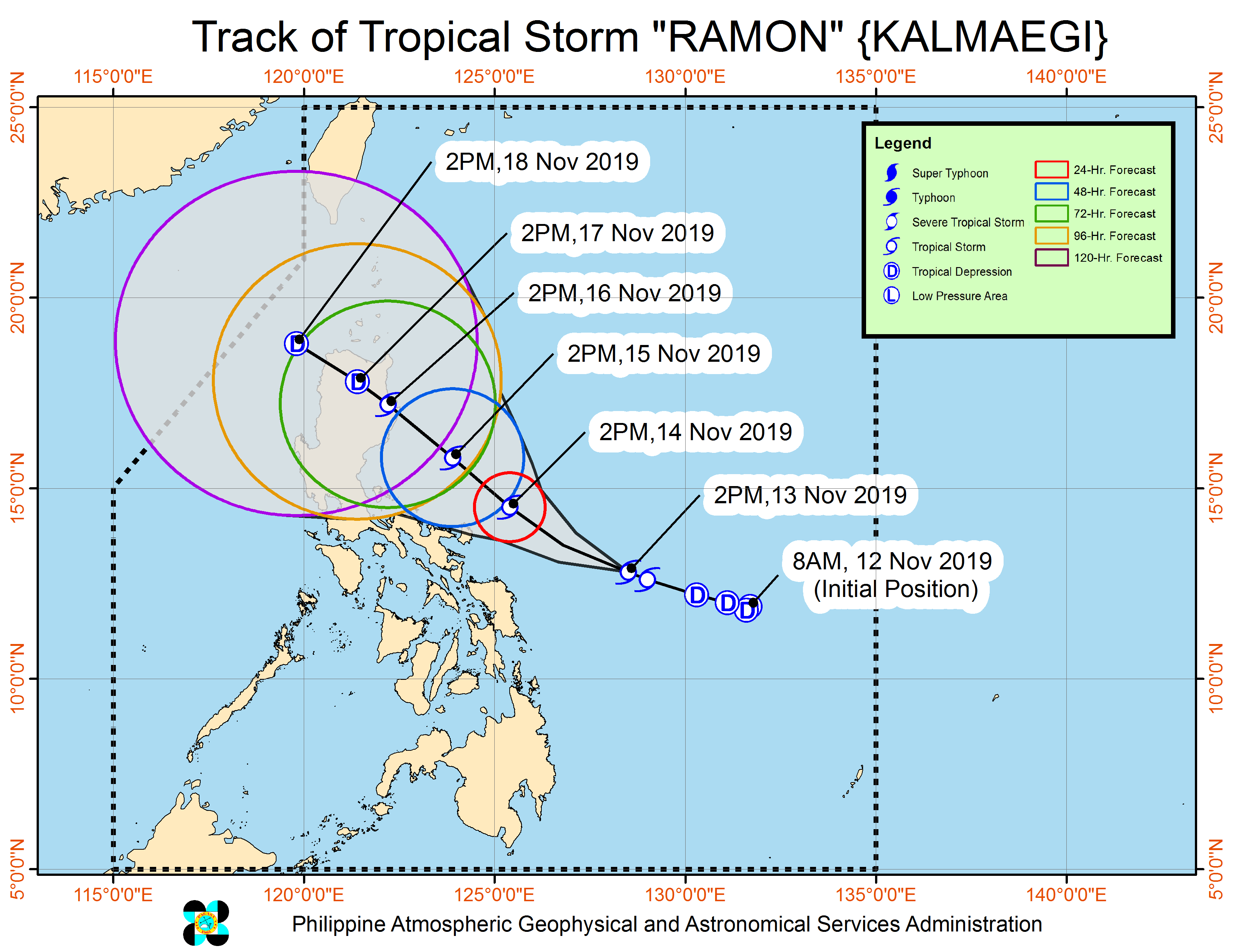 As of 4:00 PM Wednesday, Nov. 13, the center of tropical storm “Ramon” was estimated based on all available data at 390 km East of Catarman, Northern Samar (12.9 °N, 128.2 °E ).