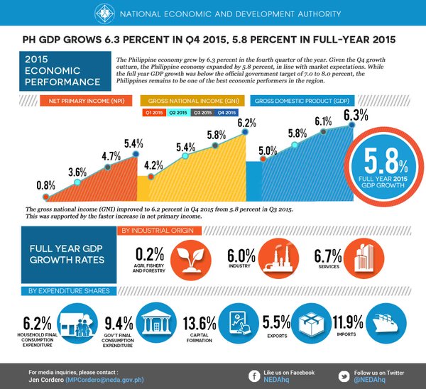 (Eagle News) — The Philippine economy grew 5.8 percent in 2015, which was below the earlier government growth target of 7-8 percent. “The acceleration of growth from the first quarter to fourth quarter has been very encouraging, bringing the average full-year growth to 5.8 percent. Though this is lower than what we targeted for the year, this growth is respectable given the difficult external environment, the onset of El Nino, and the challenges in […]