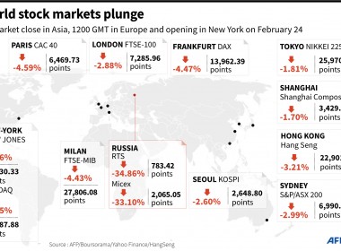 Oil surged past $105 per barrel and equities tumbled Thursday after key crude producer Russia sent forces into Ukraine, accelerating fears of a major war in eastern Europe. Asian and European stock markets nosedived — with Frankfurt shedding five percent in mid-afternoon trading — as investors fled risky equities, while haven investment, gold, rose to just over $1,955 per ounce. After weeks of warnings from the United States and other powers, Russian President Vladimir Putin […]