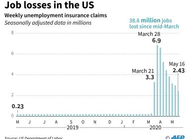 by Chris Stein Agence France Presse WASHINGTON, United States (AFP) — Job losses in the United States are slowing but totaled an unheard-of 38.6 million since the coronavirus pandemic lockdowns began, while officials debate what additional steps will be needed to rescue the beleaguered economy. Another 2.43 million Americans were put out of work last week, fewer than the previous week but still among the highest figures on record, according to the latest Labor Department […]