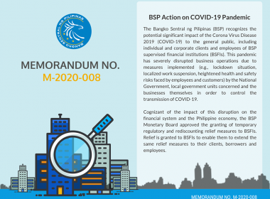 (Eagle News) – The Bangko Sentral ng Pilipinas (BSP) extended a regulatory relief package to banks and other BSP-supervised financial institutions (BSFI) to help cushion the potential impact of COVID-19 on their operations. The relief package was provided for in Memorandum No. M-2020-008, issued by the BSP shortly after its Monetary Board approved the granting of temporary relief and rediscounting relief measures to BSFIs. In a statement, the BSP said that it “recognizes the potential […]