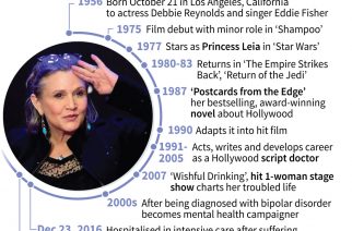 Bio of American actress and writer Carrie Fisher, best known as ‘Princess Leia’ in the Star Wars saga, who has died at the age of 60.