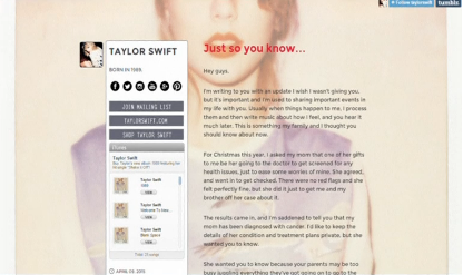 Pop star Taylor Swift, famous for sharing important events in her life, said on Thursday (April 9) that her mother is suffering from cancer and urged her millions of fans to tell their parents to get screened for the illness. The “Shake It Off” singer said in a post on the micro blogging site Tumblr that her mother was feeling fine but she and her brother asked her to go for a check-up. “The results […]