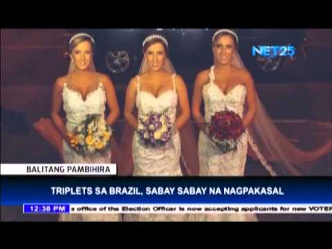 In Brazil, a set of identical triplets celebrated their wedding in a triple ceremony, with only the color of their bouquets to identify them.