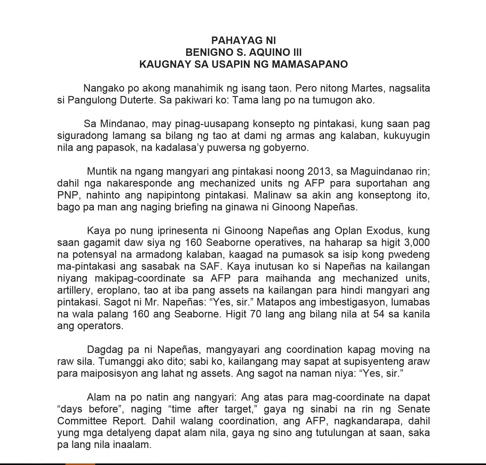 Full Statement of former President Aquino on his role in the Mamasapano tragedy