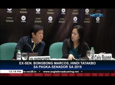 Why run when I already won as vice president, he says (Eagle News) — Former Senator Ferdinand Marcos on Wednesday ruled out the possibility of running for a seat in the Senate in 2019. In a forum in Manila, Marcos said he was “determined to finish” his electoral protest against Vice President Leni Robredo instead. “Bakit ako tatakbo ng senador e nanalo na ako ng bise presidente?..Hindi ko titigilan ito,” he said. According to Marcos, […]