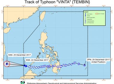 (Eagle News) — “Vinta” has intensified into a typhoon as it approaches the western boundary of the Philippine Area of Responsibility. The Philippine Atmospheric Geophysical and Astronomical Services Administration said the eye of “Vinta” was seen 355 kilometers south southeast of Pagasa Island in Palawan. It is packing maximum sustained winds of 120 kilometers per hour near the center and gustiness of up to 145 kilometers per hour. It is forecast to move west at 25 […]
