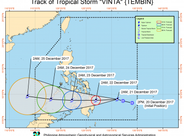 (Eagle News) — “Vinta” maintained its strength on Friday, as it moved toward Eastern Mindanao. In its 8 a.m. bulletin, the Philippine Atmospheric Geophysical and Astronomical Services Administration said as of 7 a.m., the center of the tropical storm was located 440 kilometers east of Hinatuan, Surigao del Sur. “Vinta” is packing maximum sustained winds of 65 kilometers per hour near the center and gustiness of up to 80 kilometers per hour, and is expected to […]
