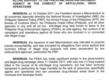 The Palace on Wednesday, December 6, made public Memorandum Order No. 17 directing the Philippine National Police and other agencies to provide “active support” to the Philippine Drug Enforcement Agency in the government’s war on drugs. Although President Rodrigo Duterte recognized the strides made by PDEA, he also recognized the agency’s lack of resources, particularly of human personnel.