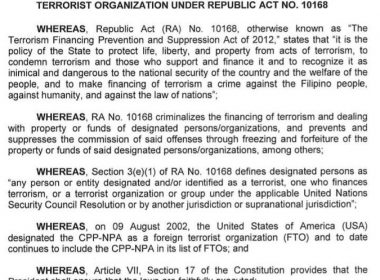 The Palace on Wednesday, December 6, released copies of Proclamation No. 374 that officially labels the Communist Party of the Philippines-New People’s Army as a terrorist organization. The group was declared as such after President Rodrigo Duterte signed Proclamation No. 3260, officially terminated talks with the communist group. Duterte said he was fed up with the rebels’ “depredatory acts” that include the killing of a four-month-old baby. He also slammed what he said was the […]