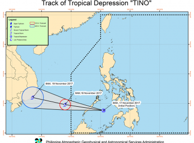 (Eagle News) — The low pressure area spotted southeast of Puerto Princesa, Palawan has developed into a tropical depression, the Philippine Atmospheric, Geophysical Astronomical Services Administration said on Friday. As of 10 a.m., PAGASA said the eye of TD Tino was located 245 km east southeast of Puerto Princesa. Tino is packing maximum sustained winds of 55 kilometers per hour near the center, and gustiness of up to 80 kph. It is forecast to move […]