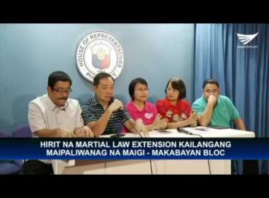 QUEZON CITY, Philippines (Eagle News) – Umalma ang mga mambabatas mula sa Makabayan bloc sa hirit na palawigin pa ang idineklarang martial law ni Pangulong Rodrigo Duterte sa Mindanao. Ayon kay Bayan Muna Rep. Carlos Zarate, hindi dapat madaliin ng Kongreso ang pag-apruba sa martial law extension. Sa halip, kailangan muna itong pag-aralang maigi upang malaman kung may batayan ang pagpapalawig dito. Dapat din aniyang mapaliwanag ang defense at security officials sa mga mambabatas kung […]