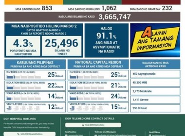 (Eagle News)–COVID-19 cases in the Philippines rose to 3,664,905 after the Department of Health reported 989 additional cases. According to the DOH, all laboratories were operational on March 1, 2022 while there five laboratories did not submit data to the COVID-19 Document Repository System (CDRS). The DOH said of the total cases, 50458 were active. Of these, 463 were asymptomatic, 45510 were mild, 2773 were moderate, 1415 were severe, and 297 were critical. Recoveries […]