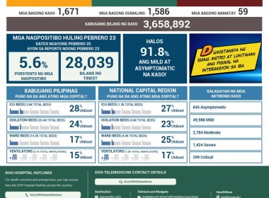 (Eagle News) — COVID-19 cases in the Philippines rose to 3,658,892 on Friday, Feb. 25, after the Department of Health reported 1,671 additional cases. The DOH said all laboratories were operational on Feb. 23 while three laboratories did not submit data to the COVID-19 Document Repository System (CDRS). According to the DOH, of the total cases, 55140 were active. Of these, 645 were asymptomatic, 49988 were mild, 2784 were moderate, 1424 were severe, and 299 […]