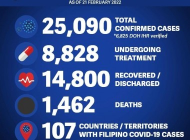 (Eagle News) — COVID-19 cases in the Philippines rose to 3,655,709 on Wednesday, Feb. 23, after the Department of Health reported 1,534 additional cases. The DOH said all laboratories were operational on February 21, while two laboratories were not able to submit their data on time. According to the department, of the total cases, 55449 were active. Of these, 652 were asymptomatic, 50258 were mild, 2811 were moderate, 1426 were severe, and 302 were critical. […]
