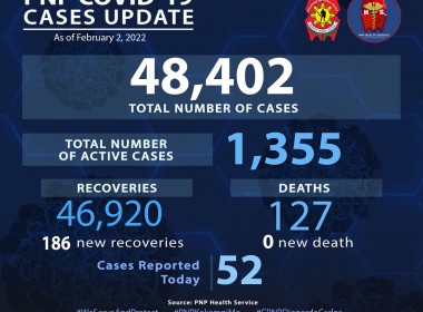 (Eagle News) — COVID-19 cases among police personnel have climbed to 48,193. According to the Philippine National Police, this was after 132 more COVID-19 cases were reported within their ranks. The PNP data showed of the total cases, 1607 were active. Over 100, or 122, more recoveries were also reported. With the additional recoveries, the PNP COVID-19 recovery tally is now at 46,460. No additional deaths were reported, which means the PNP COVID-19 death toll […]