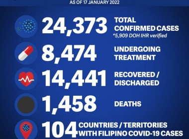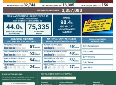 (Eagle News) — COVID-19 cases in the Philippines rose to 3,357,083 on Friday, Jan. 21, after the Department of Health reported 32,744 additional cases. According to the DOH, all laboratories were operational on Jan. 19 while three did not submit data to the COVID-19 Document Repository System. Of the total cases, the DOH said 291618 were active. Of these, 9015 were asymptomatic, 277833 were mild, 2979 were moderate, 1487 were severe, and 304 were critical. […]