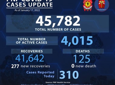 (Eagle News) — COVID-19 cases among police personnel rose to 45,782 with the addition of 310 cases. According to the Philippine National Police, of the total cases, 4015 were active. Recoveries rose to 41642 with the addition of 277 recoveries. The PNP COVID-19 death toll remains at 125. According to the Department of Health, there was a community transmission of the highly transmissible Omicron variant in Metro Manila. Metro Manila is under a COVID-19 alert […]