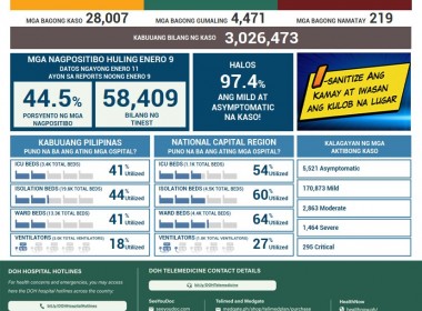 (Eagle News) — COVID-19 cases in the Philippines rose to 2,965,447 on Sunday, Jan. 9, after the Department of Health reported a record-high 28707 additional cases. According to the DOH, all laboratories were operational on Jan. 7 while 14 labs did not submit data to the COVID-19 Document Repository System (CDRS). Of the total cases, 128114 were active. Of these, 4213 were asymptomatic, 119276 were mild, 2851 were moderate, 1465 were severe, and 309 were critical. […]
