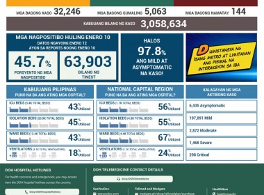 (Eagle News) — COVID-19 cases in the Philippines rose to 3,058,634 on Wednesday, Jan. 12, after the Department of Health reported 32,246 additional cases. According to the DOH, all laboratories were operational on January 10 while 11 labs did not submit data to the COVID-19 Document Repository System (CDRS). The DOH said of the total cases, 208164 were active. Of the active cases, 6435 were asymptomatic, 197091 were mild, 2872 were moderate, 1468 were severe, […]