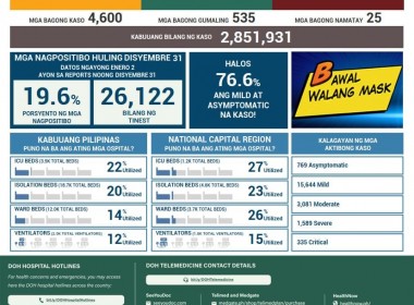 (Eagle News) — COVID-19 cases in the Philippines rose to 2,851,931 after the Department of Health reported 4,600 additional cases on Sunday, Jan. 2. This is an increase of almost 1,000 cases from the 3,617 additional cases reported the day before. The DOH said two laboratories were not operational on December 31, 2021 while nine laboratories did not submit data to the COVID-19 Document Repository System (CDRS). According to the DOH, of the total cases, […]