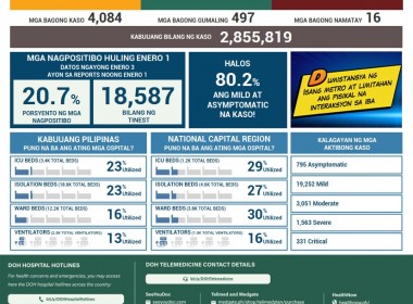 DOH says 21 labs did not submit info to the COVID-19 repository system, two labs were not operational on Jan. 1 (Eagle News) — COVID-19 cases in the Philippines rose to 2,855,819 on Monday, Jan. 3, after the Department of Health reported 4,084 additional cases. According to the DOH, two laboratories were not operational on January 1, 2022 while 21 did not submit data to the COVID-19 Document Repository System (CDRS). The DOH said of […]