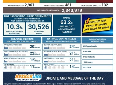 (Eagle News) — COVID-19 cases in the Philippines rose to 2,843,979 after the Department of Health reported additional 2,961 cases on Friday, Dec. 31. The OCTA research group has said the COVID-19 reproduction rate was now at 2.19, the highest since July 2020. According to the DOH, the active cases also rose to 14233. Of the active cases, 628 were asymptomatic, 8365 were mild, 3197 were moderate, 1701 were severe, and 342 were critical. Recoveries […]