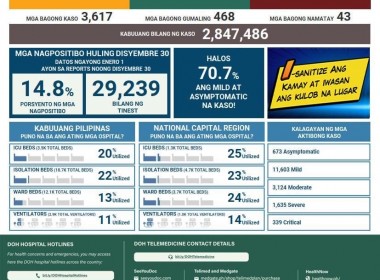 (Eagle News) — COVID-19 cases in the Philippines rose to 2,847,486 after the Department of Health reported 3,617 additional cases. The figure is an increase from the 2,961 additional cases reported on Friday, Dec. 31. According to the DOH, two laboratories were not operational on December 30, 2021, while six labs did not submit recent data to the COVID-19 Document Repository System (CDRS). The DOH said of the total cases, 17374 were active. Of these, […]