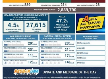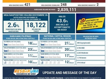 (Eagle News)–COVID-19 cases in the Philippines rose to 2,839,111 on Tuesday, Dec. 28, after the Department of Health reported 421 additional cases. According to the DOH, of the total cases, 9750 were active. Of these, 489 were asymptomatic, 3766 mild, 3343 moderate, 1778 severe, and 374 were critical. Recoveries rose to 2,778,148 with the additional 248 recoveries. The COVID-19 death toll is now at 51213, with the additional two deaths. On Tuesday, the DOH called […]