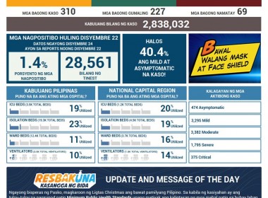 (Eagle News) — COVID-19 cases in the Philippines rose to 2,838,032 on Friday, Dec. 24, with the addition of 310 cases. According to the Department of Health, of the total cases, 9321 were active. Of the active cases, 474 were asymptomatic, 3295 mild, 3382 moderate, 1795 severe, and 375 were critical. Recoveries rose to 2,777,661 with the addition of 227 recoveries. The COVID-119 death toll is now at 51050, with the addition of 69 deaths. […]