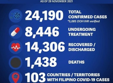 (Eagle News) –Fifty-nine more COVID-19 cases have been reported among overseas Filipinos. According to recent data released by the Department of Foreign Affairs, the additional cases pushed the total detected COVID-19 cases among Filipinos abroad to 24190. Seventy-nine more Filipinos outside the country have been tagged as recoveries, pushing the total COVID-19 recoveries to 14306. The COVID-19 death toll among overseas Filipinos, however, is now at 1438 with the 10 additional deaths. According to the […]