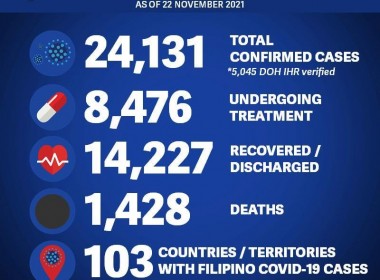 (Eagle News) — Over 100 overseas Filipinos have tested positive for COVID-19, Department of Foreign Affairs data showed on Tuesday, Nov. 23. According to the DFA, the additional 171 cases pushed the total COVID-19 cases among Filipinos abroad to 24131. Forty-two more have recovered, pushing the COVID-19 recovery tally to 14227. COVID-19 deaths among Filipinos abroad rose to 1,428 with the addition of one death. The Middle East and Africa are still the regions with […]