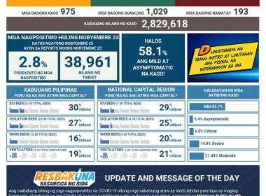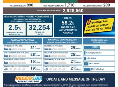 (Eagle News) — The Department of Health on Wednesday, Nov. 24, reported 890 additional cases, pushing the COVID-19 tally to 2,828,660. The DOH reported 200 more COVID-19 deaths, leading to an increase in the COVID-19 death toll in the country to 47682. Of the 17864 active cases, the DOH said 53.4 percent were mild, 4.8 percent asymptomatic, 6 percent were critical, and 14.4 percent were severe. Of the total active cases, 21.39 percent are moderate. […]