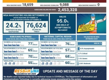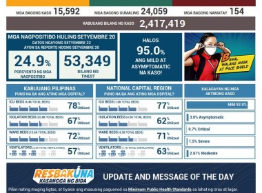 (Eagle News) — COVID-19 cases in the Philippines rose to 2,417,419 on Wednesday, Sept. 22, after the Department of Health reported 15,592 additional cases. The DOH said of the total cases, 162580 are active. Of these, 92 percent are mild, 3 percent asymptomatic, 0.7 percent critical, 1.5 percent severe, and 2.81 percent were moderate. Recoveries rose to 2,217,611 with the addition of 24,059 recoveries. The COVID-19 death toll is now at 37,228 with the addition […]