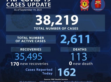 (Eagle News) — Over 100 more police personnel have tested positive for COVID-19. The Philippine National Police said the additional 162 cases pushed the total PNP COVID-19 cases to 38219. Of these, 2611 are active. Recoveries rose to 35495, with the addition of 170 recoveries. The PNP COVID-19 death toll remains at 113, with no additional deaths. The police are among the priorities in the country’s ongoing COVID-19 vaccination program as members of the A4 […]